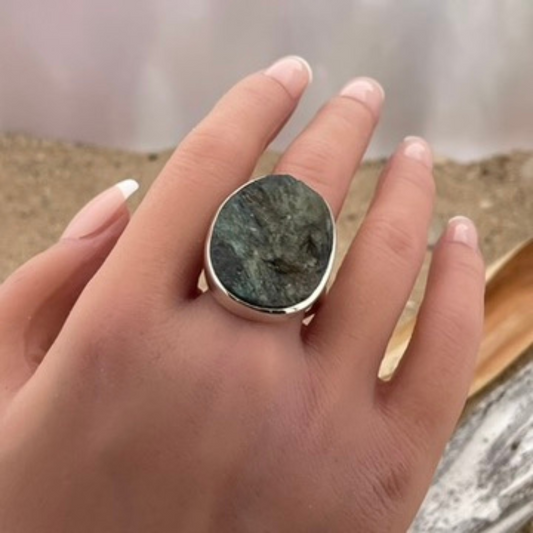Labradoriet ruw zilveren ring maat 62+