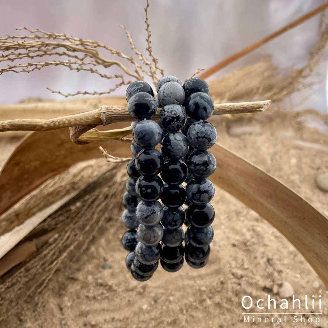 Sneeuwvlok Obsidiaan is een zachte obsidiaan soort. Hij helpt je meer inzicht te krijgen in jezelf. Deze obsidiaan schept evenwicht tussen lichaam, ziel en geest. Het zorgt voor innerlijke rust en vrede. Het helpt bij het verwerken van trauma's en geeft meer inzicht. Hij maakt je rustig als je je onrustig voelt en vermindert je angsten.